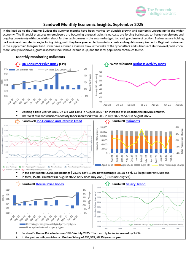 A monthly report which gives an overview of key economic trends ongoing within the Sandwell borough and the wider region, looking at policy changes, economic shocks, and new business deals and investments.