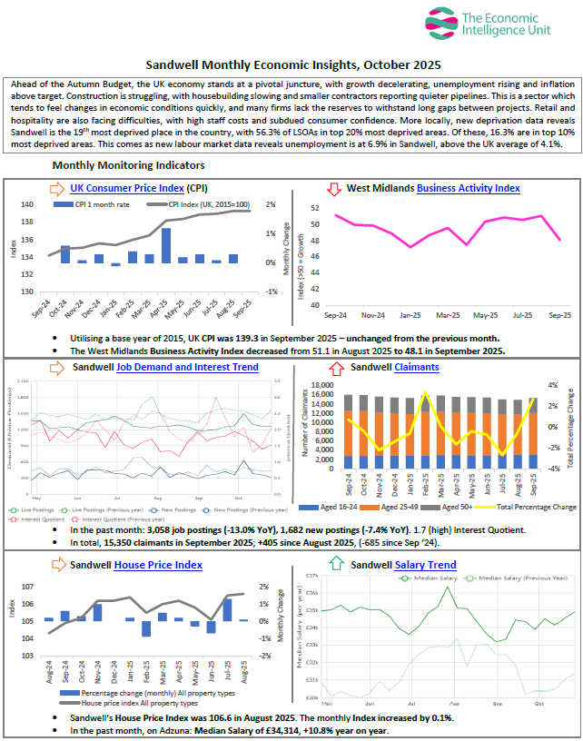 A monthly report which gives an overview of key economic trends ongoing within the Sandwell borough and the wider region, looking at policy changes, economic shocks, and new business deals and investments.