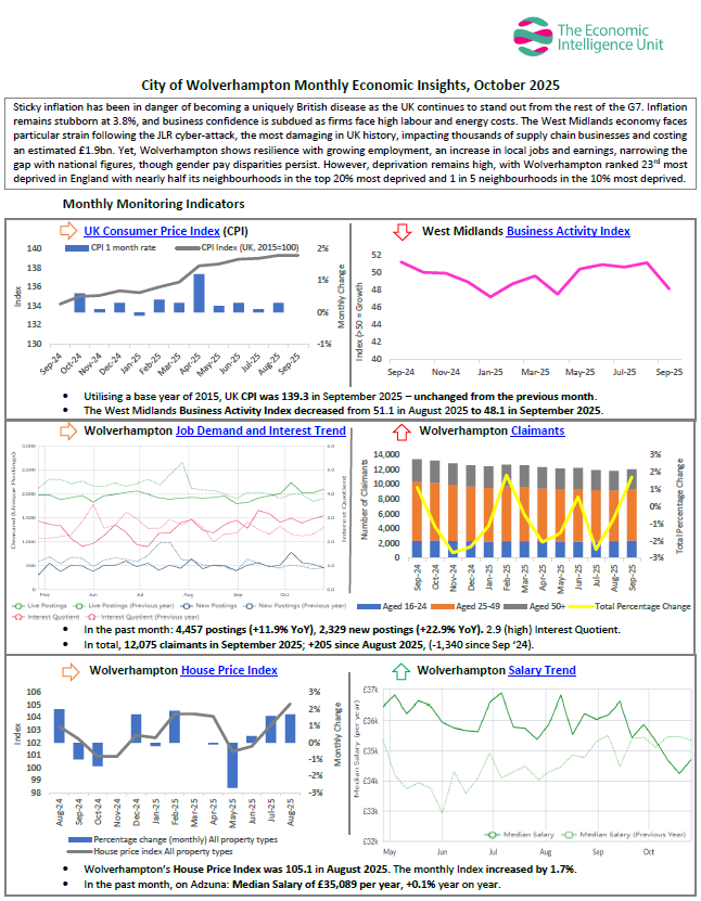 A monthly report which gives an overview of key economic trends ongoing within the City of Wolverhampton and the wider region, looking at policy changes, economic shocks, and new business deals and investments.