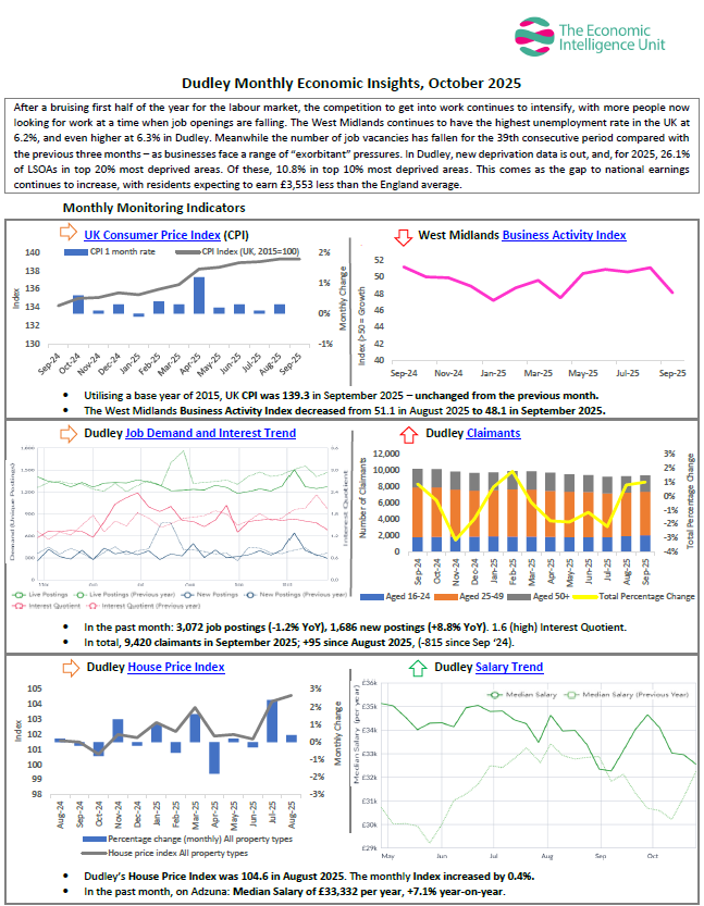 A monthly report which gives an overview of key economic trends ongoing within the Dudley borough and the wider region, looking at policy changes, economic shocks, and new business deals and investments.