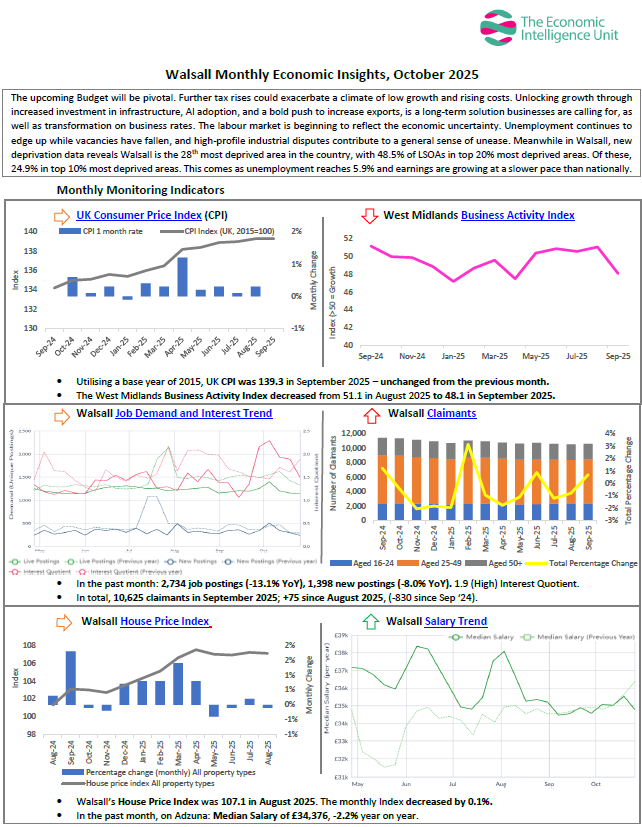 A monthly report which gives an overview of key economic trends ongoing within the Walsall borough and the wider region, looking at policy changes, economic shocks, and new business deals and investments.