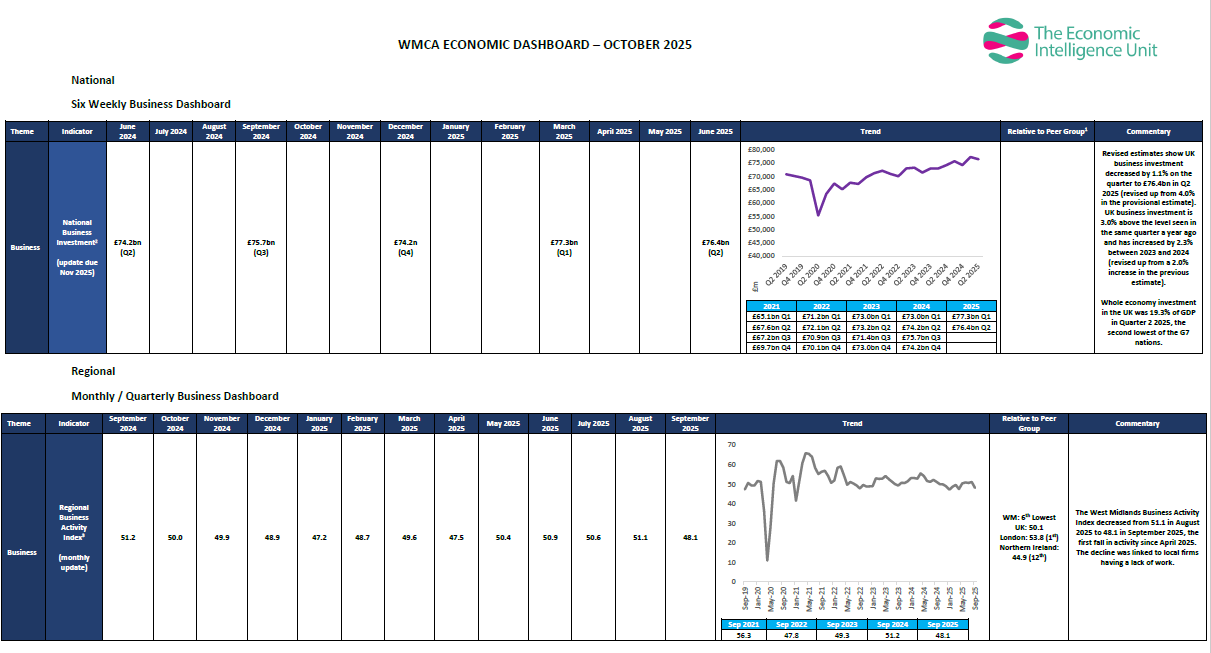 A dashboard showcasing an array of information relating to the economy of the WMCA